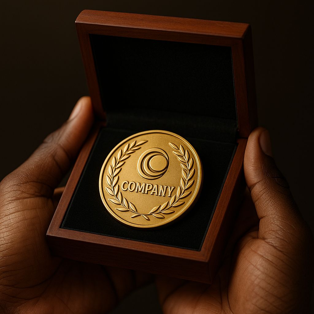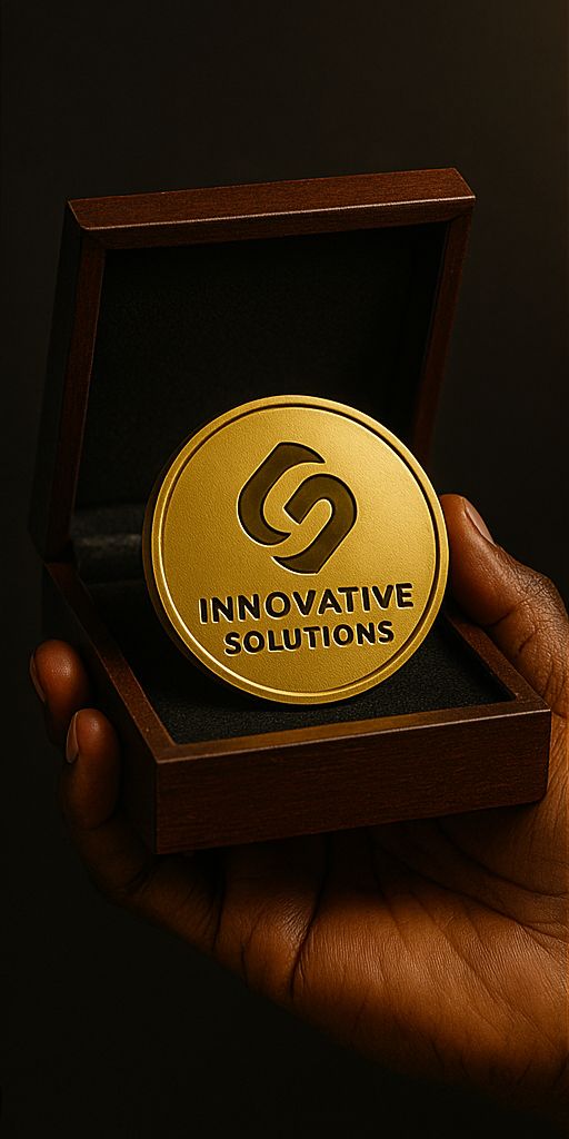 A premium gold medallion presented in a luxury wooden case, engraved with the “Innovative Solutions” logo. This piece represents corporate prestige and recognition, designed for excellence awards, executive appreciation, and milestone achievements. Its mirror-polished finish and embossed laurel detailing reflect class and accomplishment.